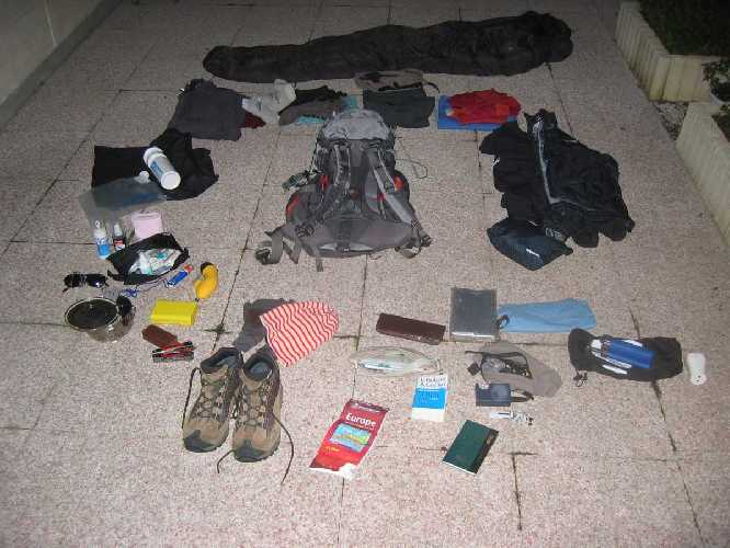 _ 1 paire de chaussure _ 3 t-shirts _ 2 pantalons dont un convertible en short _ 3 paires de chaussettes _ 3 caleçons _ 1 pull _ 1 polaire _ 1 doublure matelassée _ 1 bonnet _ 1 paire de mitaine _ 1 pélerine _ 1 paire de lunette